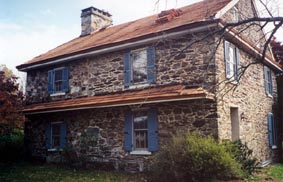 Harlans who tour the Brandywine Valley area of Pennsylvania can get a tangible sense of how far back our history goes in this country. Two homes built by first-generation Harlans, sons of George and Michael, are still homes today, and the two original Quaker Meetings, around which the first American Harlans centered their lives, still serve congregations today. The Harlan Log House, on Fairville Road in Chadds Ford, was built on land deeded from George Harlan (#3) to his son Joshua. It is now both a family home and a bed and breakfast. Guests stay in the original section of the house, which Joshua built with squared-off logs sandwiched between layers of mortar and rocks. Now on a parcel of five acres, the building originally sat on 200 acres deeded to Joshua �in consideration of natural affection and Fatherly love.� An 1814 spring house stands near the house which is listed on the National Register of Historic Places. The Harlan House/Stargazer Farm is also on the National Historic Register. This stone house was built c.1724 by Michael Harlan�s son George (#14) on purchased land that was originally granted to William Penn in 1681. Harlan descendants lived in the house until 1950. It is now the home of veterinarian and Harlan history friend, Dr. Kate Roby, who is also a freelance medical writer. Roby is in the process of restoring the building and has discovered curious aspects of the Harlan history in the process. The place is called the Stargazer Farm because this
